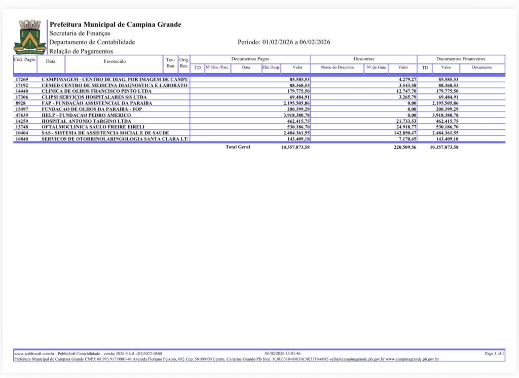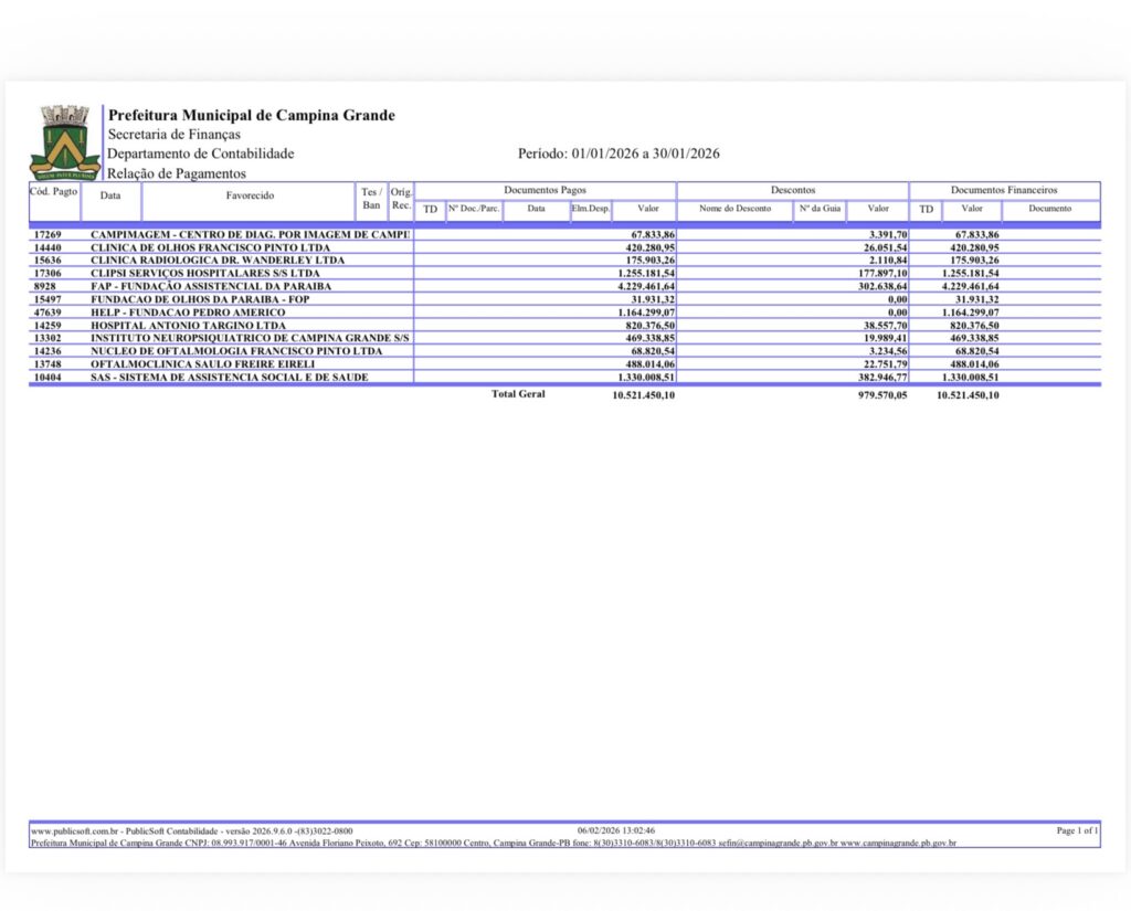 A Prefeitura de Campina Grande cumpriu o acordo firmado para regularizar os repasses aos hospitais contratualizados da cidade e transferiu nesta quinta-feira, 5, mais R$ 10,3 milhões às unidades privadas. Como em janeiro, já tinha havido a transferência de R$ 10,5 milhões, em dois meses o Município repassou R$ 20,8 milhões para a rede conveniada.